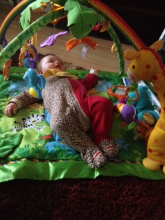I spent about 3 hours sleeping on the floor with him this morning when his shrieking started up. I’ve done that quite a bit when he gets loud enough. He’s not crying, but proximity to one of us usually quietens him down. So it’s either one of us on the floor, or Chris on the couch and him in the bed with me. Bet the baby book writers would love that. Way to teach him how to get what he wants instead of just putting himself back to sleep. But since he sleeps pretty well most of the time, we don’t care, and they aren’t here to assist me when I stumble into a wall because I can barely open my eyes. I barely consult baby books anymore because the normal every day stuff doesn’t phase me now. So he may not have the perfect nap schedule or all those other details that fill 500 page books. He’s a happy baby.