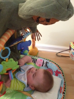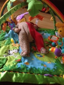 We have a feeling he might just bypass crawling since that doesn’t come easy to chunky babies and he is pretty strong when you put him in a standing position. Plus, his answer to tummy time is to conk out after a couple minutes because he doesn’t like to work. He’s like his mommy. You want me to do what? Yard work?…mommy crawls behind sweaters hanging in closet and passes out. He might actually just resort to doing the backstroke on land. Lately he’s been scootching himself  several inches up when lying on the changing table and in the crib. So frankly, he probably considers it silly to go to all the effort of turning himself over.