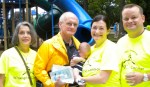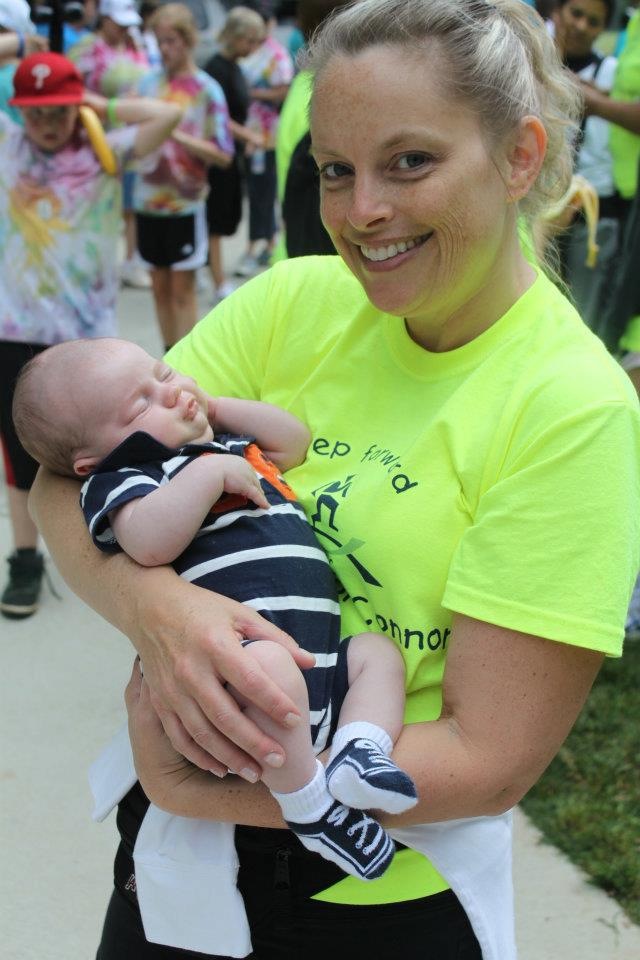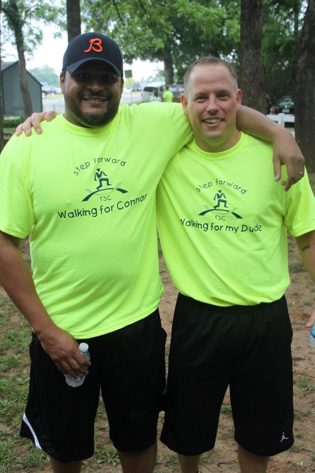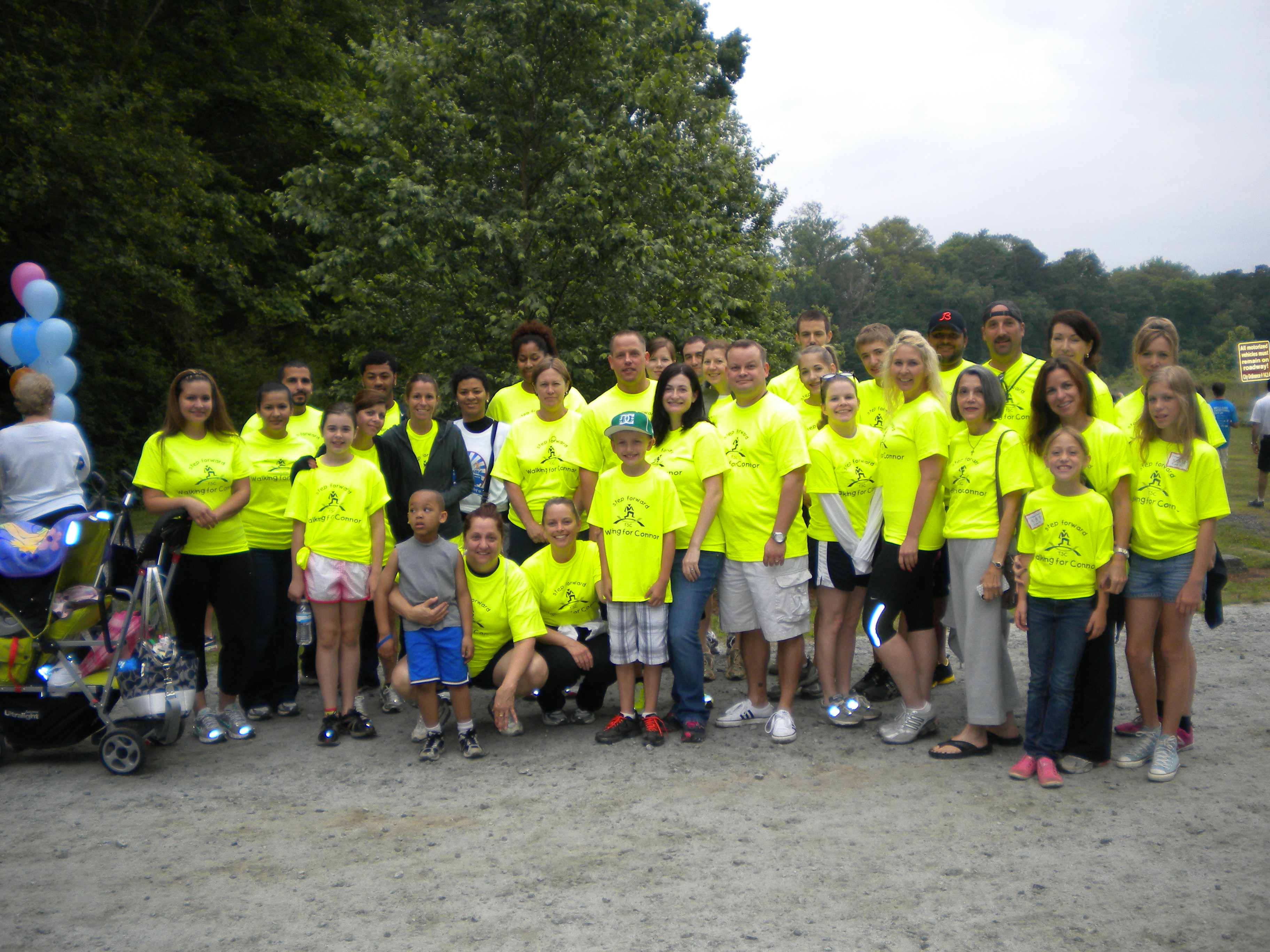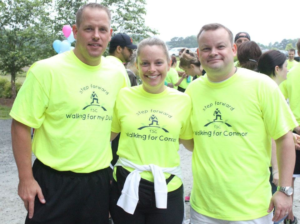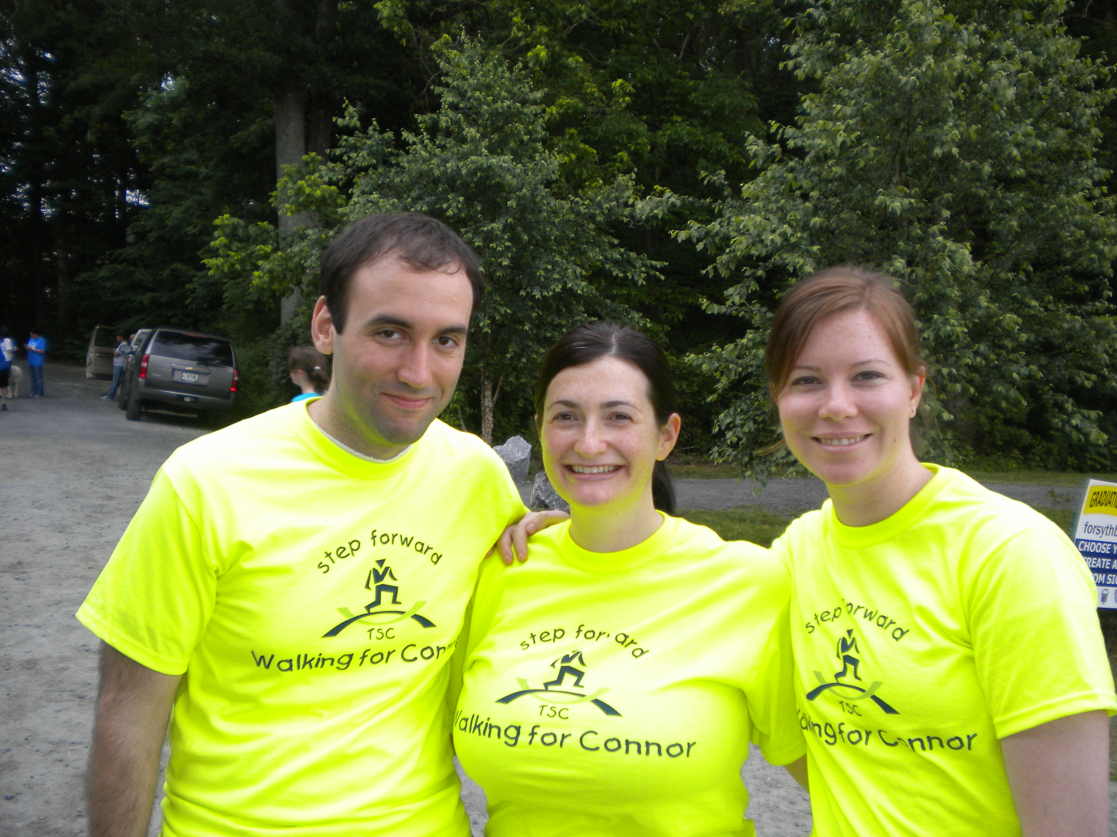 And now to go back in time to something that really touched me. Connor was born at the end of March, which was the beginning of our journey to figure out this tuberous sclerosis mystery. Imagine going from never having heard of something to learning that a fundraising walk is held annually at a park barely a couple miles from the house you grew up in. We didn’t even have two months from the time he was born until the Atlanta area walk to organize and raise money, but my friend Kate set up the team registration for me since it didn’t take much to trigger my anxiety at that point. The mere logo for the TS Alliance could trigger a tightening in  my chest and lightheaded feeling that would force me off my feet. We have an adorable little TSC bear clad in a TS Alliance shirt. Connor loves it, but I had to turn the shirt inside out at the time. I didn’t think we had much time to raise any money, so we set the team goal at $1,000. Chris’s sister Donna and brother Carey got in touch with friends who owned a t-shirt company and designed a team shirt. As you’ll see below, they chose a color that guaranteed we wouldn’t be missed. Carey provided them for everyone who walked. I was amazed when we had about 30 friends and family walk for him and the team raised over $6,000. Some of my co-workers that walked even wore their team shirts to school to help raise awareness.