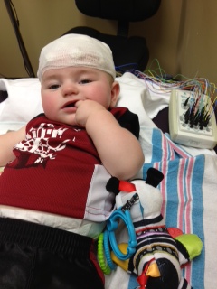 There’s good news and bad news. The bad news is that after another hour long EEG, we still aren’t really sure what the deal is with these eye rolling incidents he’s having once or twice a day. And unlike the last time, when we spent 8 hours in an office with electrodes on his head only to have an episode on the way home, this time he had an episode in the waiting room right before it. At least the EEG showed once again that the hipsarythmia brain pattern that previously presented with his spasms has cleared up thanks to Sabril. The doctor doesn’t seem certain whether these are spasms or not, although he can’t say they aren’t some sort of seizure activity. He was very pleased with how well Connor is doing though because he isn’t presenting like a child having infantile spasms. At any rate, we are weaning him off one of his meds, phenabarbitol, so that we can see if clonazepam is more effective at knocking out whatever these eye rolls are. There was still no seizure activity otherwise (thanks again to our surgeon), which leads me to the other good news: during the EEG today they tried to see if a strobe light would trigger anything. It had no effect on him whatsoever, so Connor’s going clubbing this weekend.