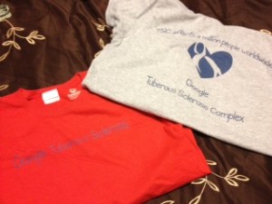 UPS truck! UPS truck! I’m very anti t-shirt so I took it upon myself to make a couple t-shirts for TSC awareness. I like to keep it simple on the front, and put the big stuff on the back. Thank, Custom Ink, for allowing me to be a t-shirt prima donna. If anyone wants one, color and shirt style can be changed. You have to order at least 10 for discount pricing.