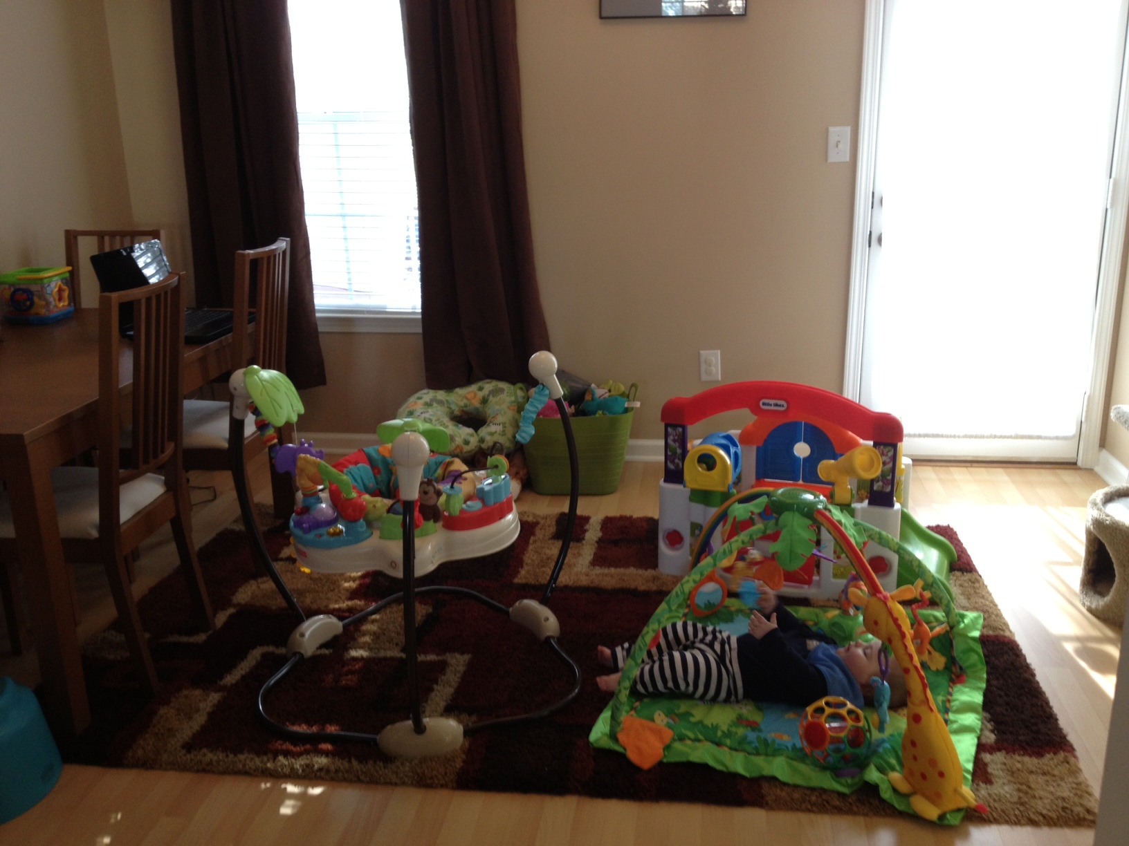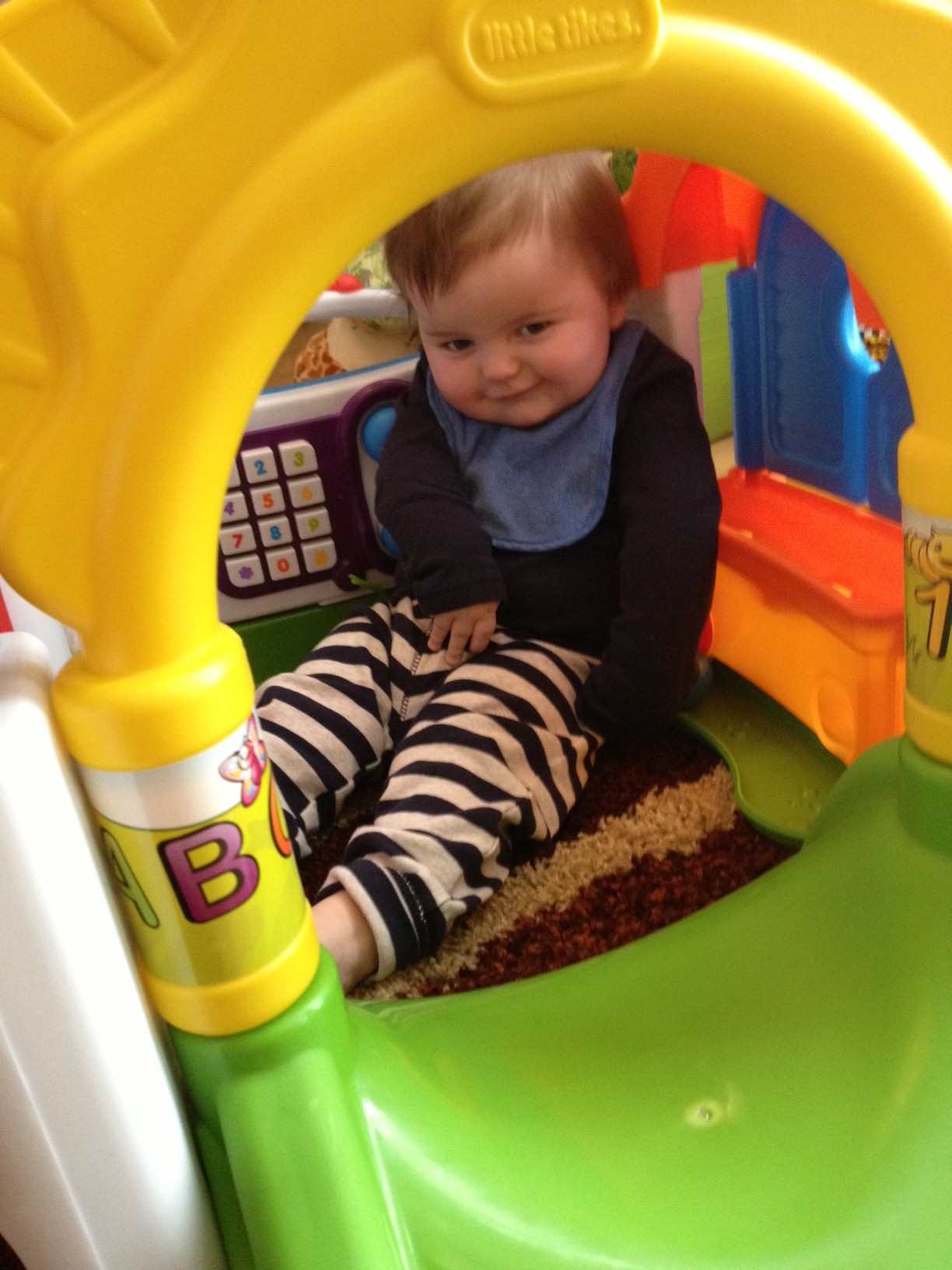 Our new dining room. Dinner guests can fight over the jumperoo.In his new playhouse. His trump card in the battle of the dining room.
