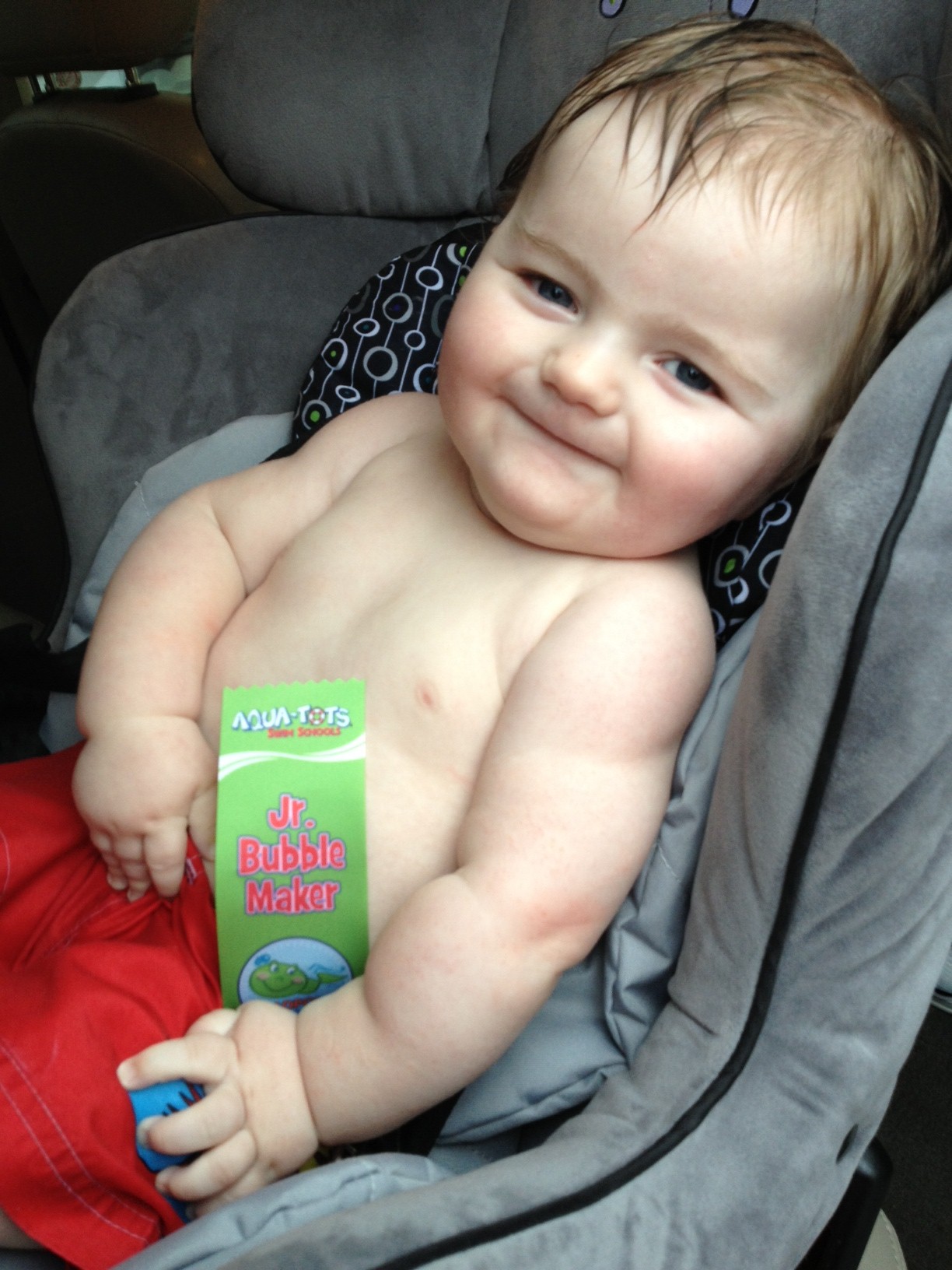 We had a highly amusing moment in swim class the other week. One of the baby skills is blowing bubbles in the water. I kid you not, right as the instructor has us put our mouths under to do so, Connor makes the most incredible bubbles you’ve ever seen. Just not with his mouth.