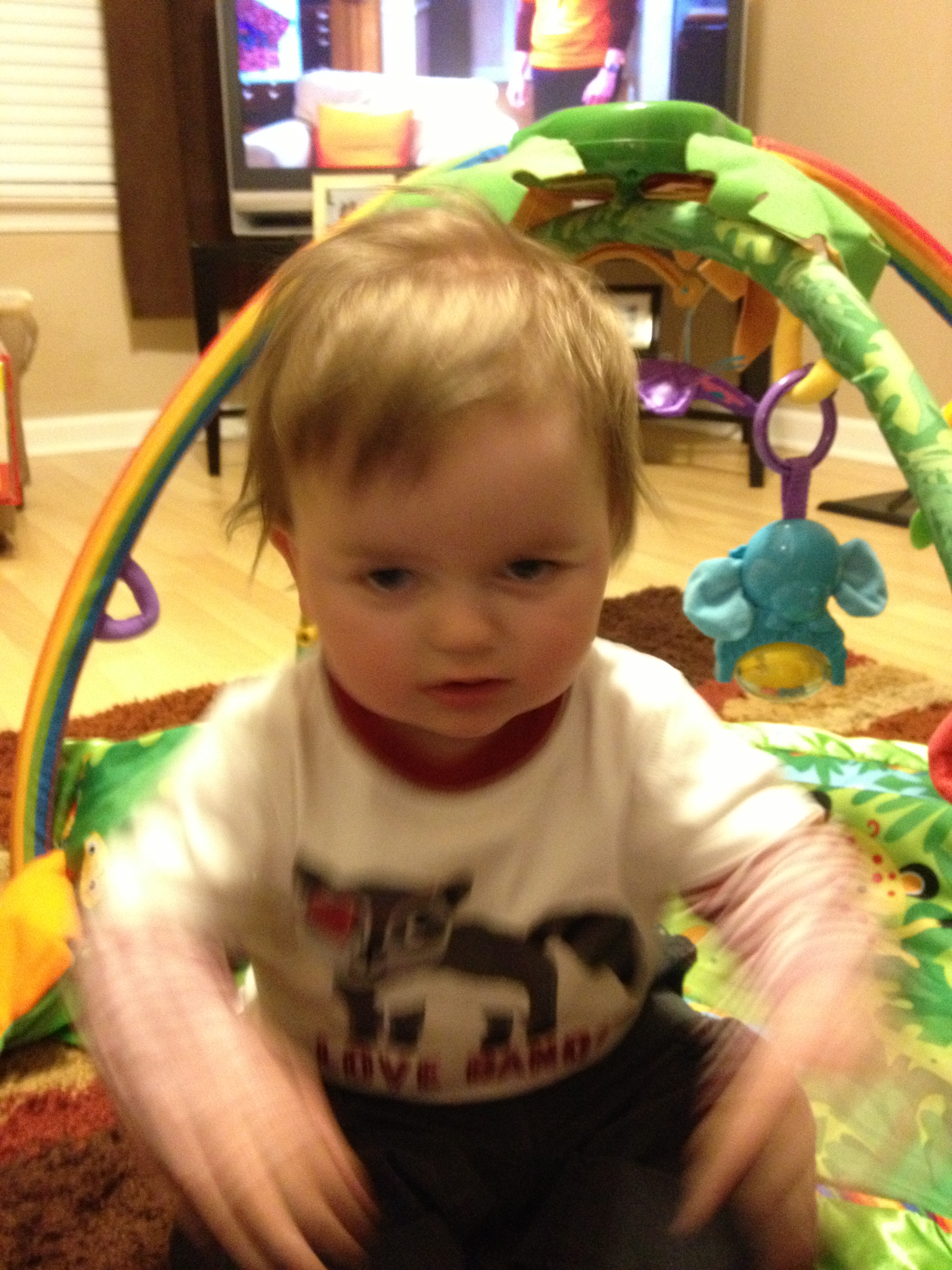We received the assessment results within a couple days. Areas of concern: visual reception (have to look into this more, I think it means he wasn’t paying much attention to the screen with flashing pics-we’re hoping a factor in this was that he was quite tired and not really wanting to keep his head up to look at the screen), expressive language (already looking into speech therapy, since he can certainly be noisy, but isn’t yet making consonant sounds), and gross motor (already getting PT). Not really major surprises. Receptive language was a slighter delay, meaning while he seems to recognize some words, he doesn’t consistently respond to them. I definitely notice that when he’s in a good mood, he’s pretty responsive. If he’s tired or disinterested, he’s pretty good at ignoring me. Interestingly, his fine motor skills were right on target, something I already thought to be the case.