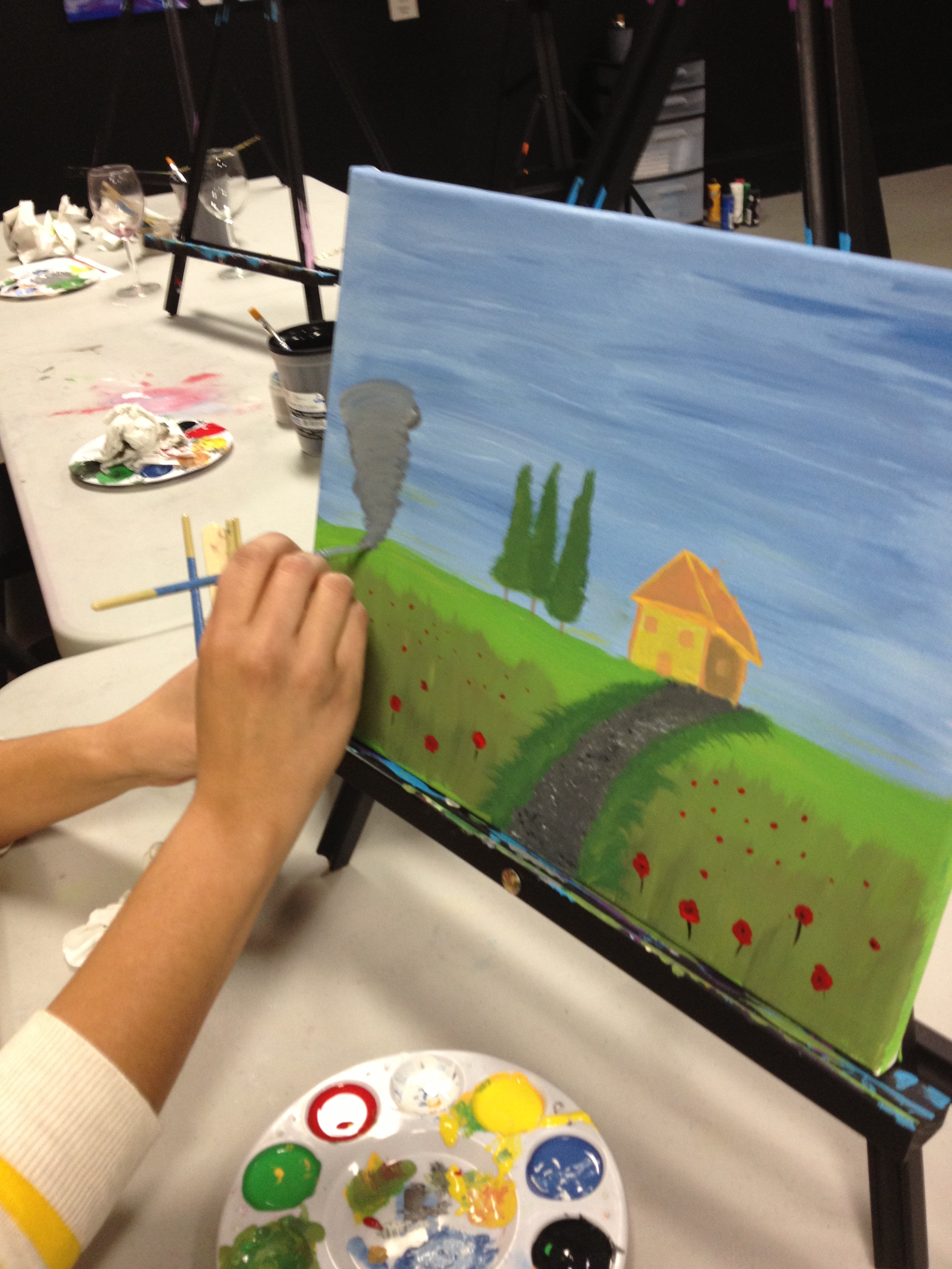 Meanwhile, in adult world, I’ve been trying to motivate myself to go out more. It’s so easy to be lazy and do nothing when it’s cold AND you have a kid. I actually had two social engagements in one weekend. I felt like I was 27 again! Chris and I attended a paint and wine tasting function at a local gallery with our friends Giovana and Damien, taught by our friend Yuri Strom (insert reference to Yuri so that when she’s famous I can prove I know her). I love the way each of our paintings shows our personality. My “I need to please by doing it right, but I’m trying to emulate a carefree lifestyle” painting, Chris’s “OCD everything must be symmetrical” painting, Damien’s “I’m just here for the wine, so my sun’s gonna set in the east if I feel like it” painting, and Gio’s “I’ll show you, happy Tuscan countryside, exactly what pain is” painting.