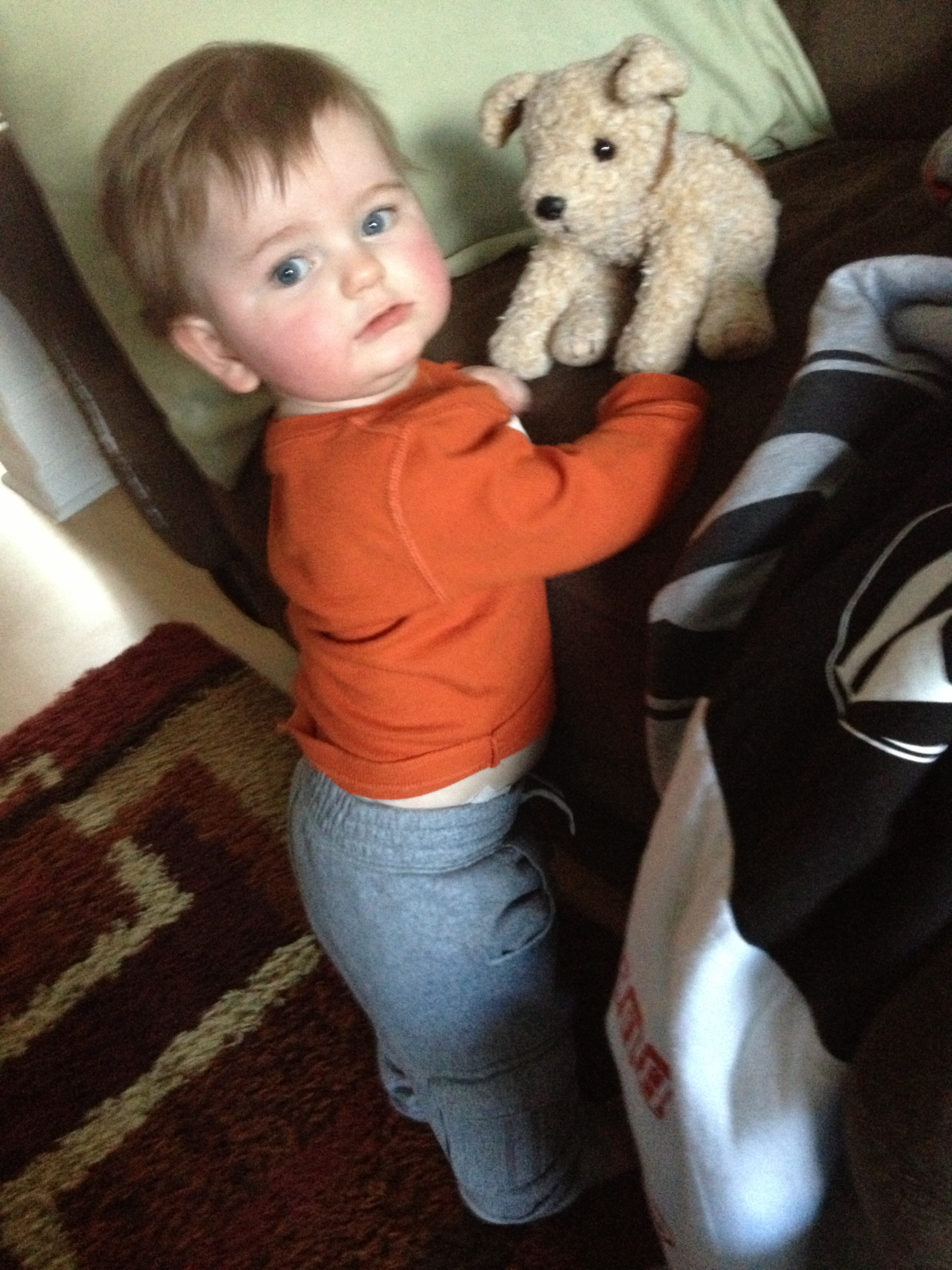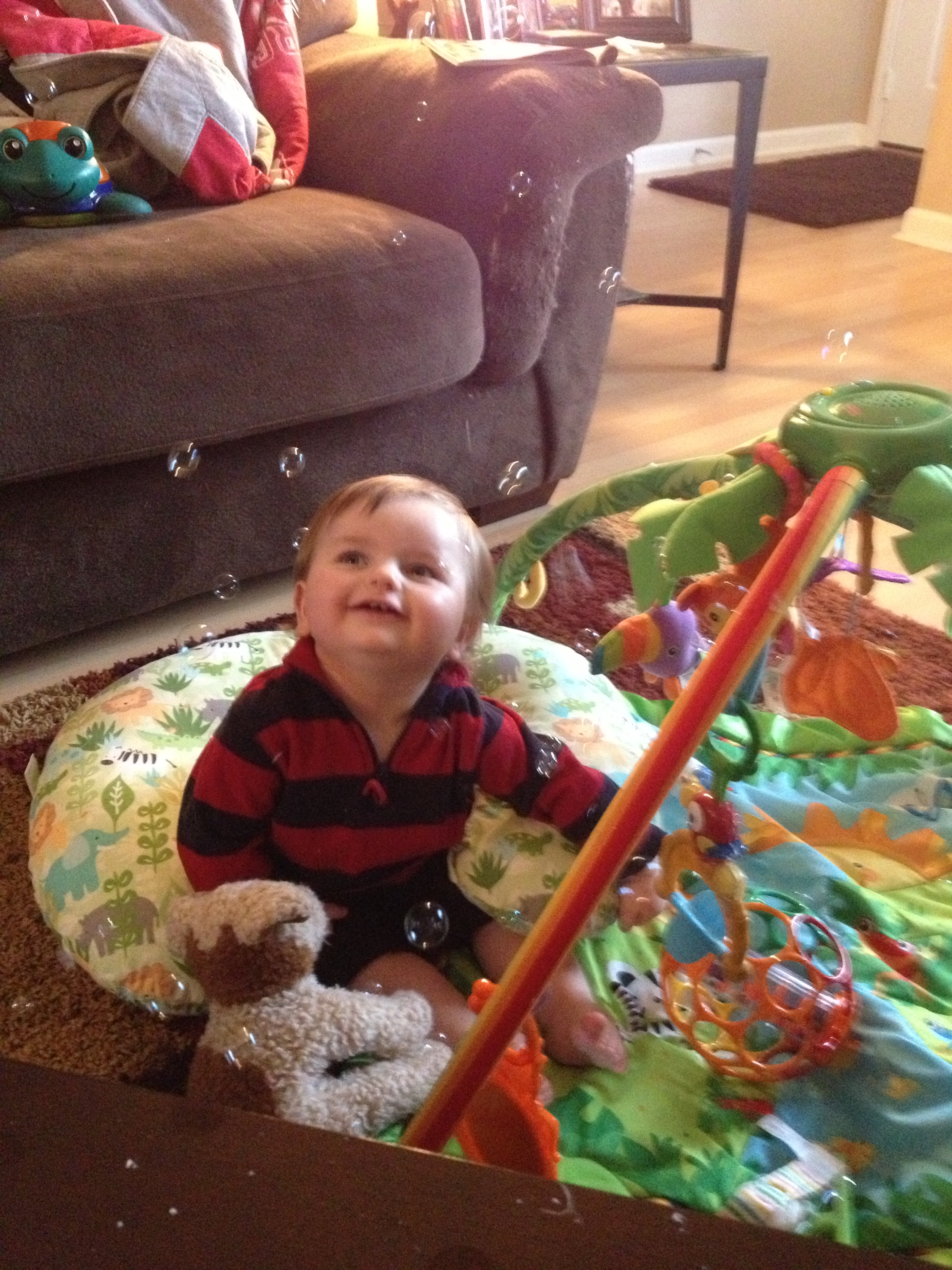 Connor can now stand when bracing himself against the couch, which is nice. He is also firmly into the “it’s fun to throw everything on the floor” phase, which is less nice. He started speech therapy last week, and I sense some of his grumbling will eventually form into four-letter words. His speech therapist brought him some awesome bubbles that are unlike your standard Target bubbles. These don’t pop as easily, allowing him to catch them, stack them, and for me to scrape them off furniture for days afterward. But look how much fun he’s having.