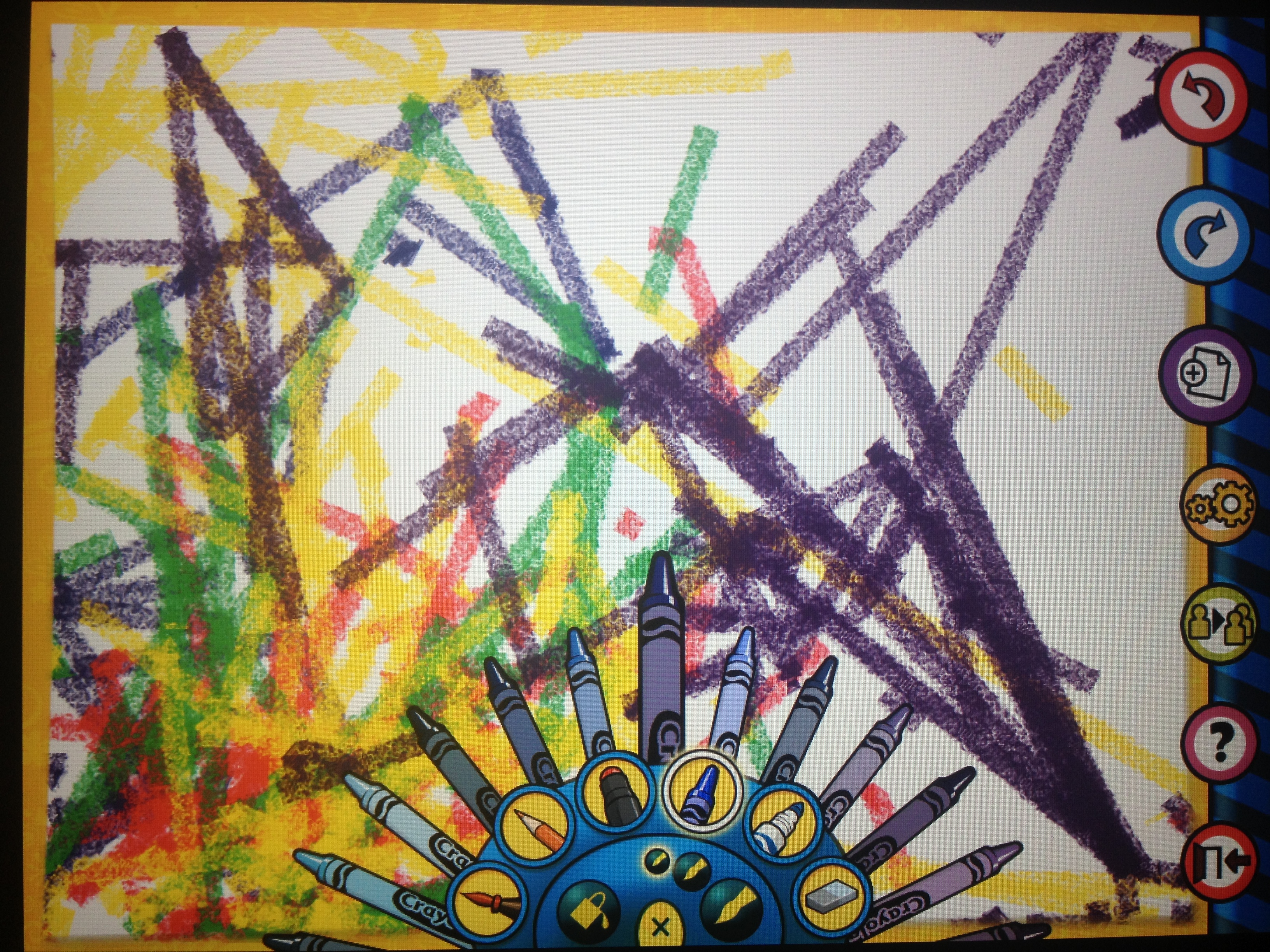 A more recent download is the Crayola App which allows him to use his finger to color. He just has to touch it to make the colors appear, and I only helped him as far as changing colors for him. And he seemed to notice that I was changing the colors.