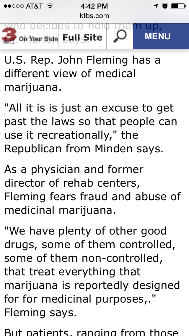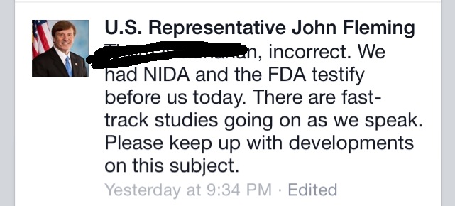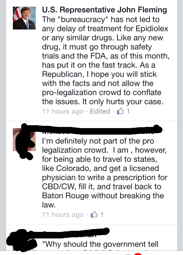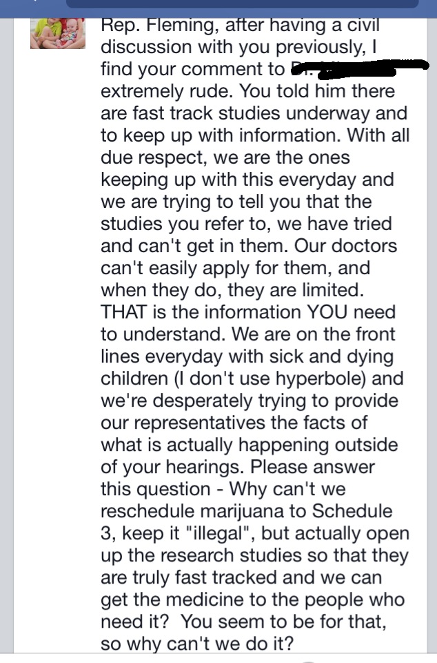 Rep. Fleming is very, very worried about recreational use. Our children are nothing but Trojan Horses (his words) used by those who want full legalization for recreational purposes. He is so worried about recreational use and the fear that someone might find a way to use medical cannabis for fun, that he is willing to sacrifice the lives of sick and dying children. He is not interested in hearing our stories of our children that need it or those that are already benefitting from high CBD strains and THCA in legal states. He voted against the recent Rohrbacher amendment to prevent funding the DOJ for raiding state medical marijuana programs. In fact, if you try to tell him about your child on his Facebook page, he will delete it. He can’t have the public know who he’s hurting with his over-the-top antics.