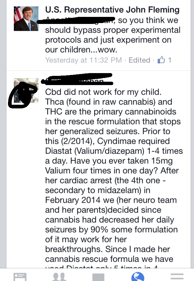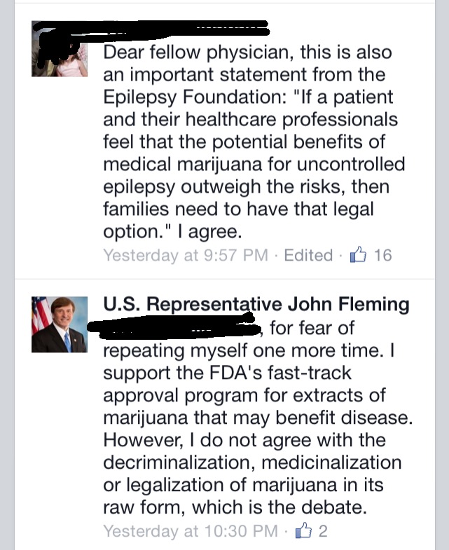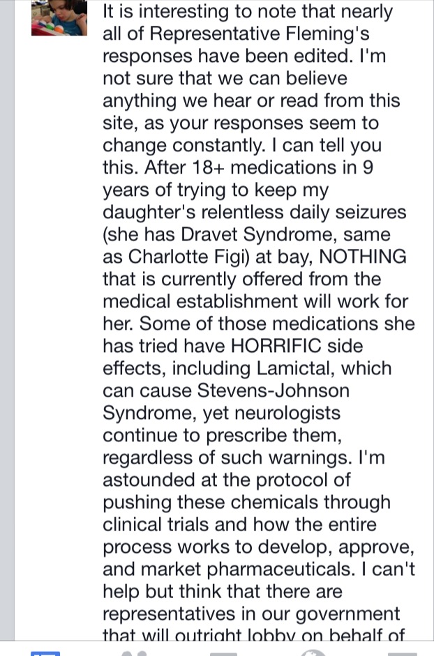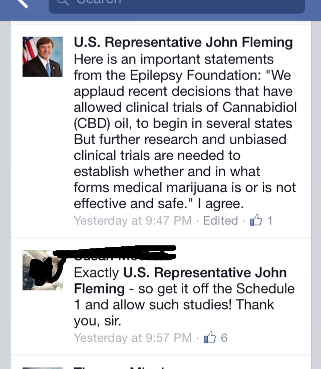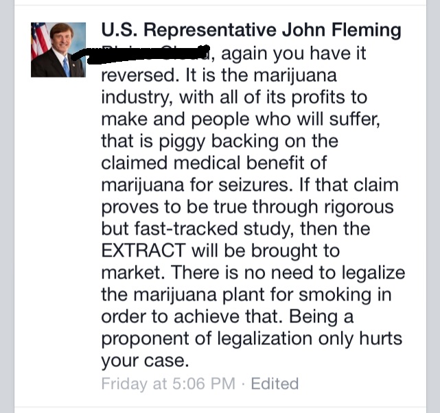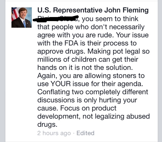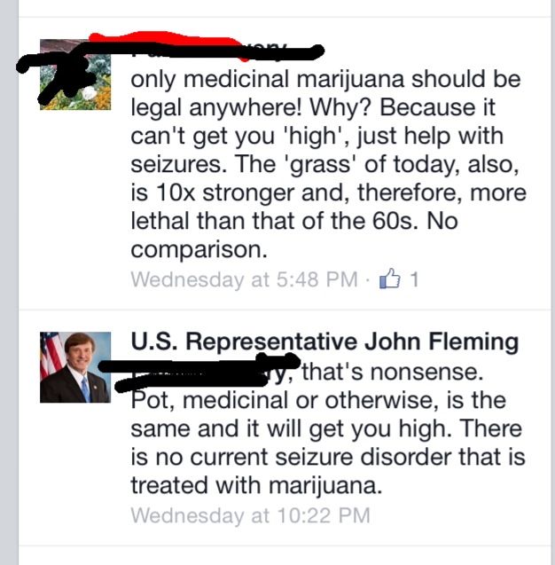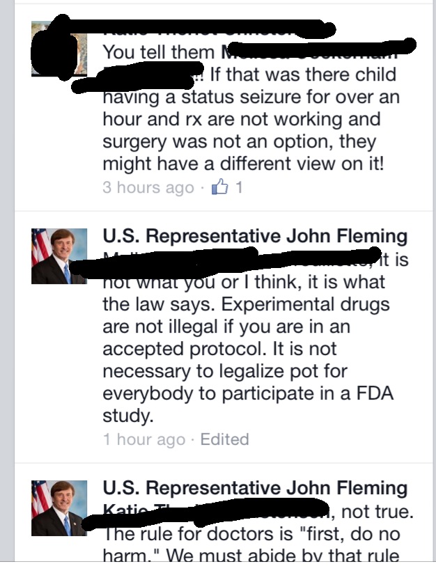I’m not the only one. Several people who talked about their kids got deleted. Interestingly, he started debating with one of the parents–also a doctor –and did not delete or block him. However, he DID delete a link to a YouTube video that this father had made about his daughter and medical cannabis to educate the public. Interesting. Rep. Fleming is so passionate about Facebook page maintenance that he even stayed up until midnight on a Friday to edit, delete, and condescend. Yes, condescend. You may wonder why I find this particular representative so interesting when he is obviously not the only one who opposes helping our kids. Well, though I was blocked, I still found myself quite fascinated poring through his page. It became clear that his page serves no purpose but to rile people up and be divisive. It’s not even about whether I agree with his views or not; it’s that he clearly uses it as a tool of stirring discontent. Don’t get me wrong. I pretty much expect to see Obama-slamming on most GOP pages, just as there is some over-the-top Obama adoration on the pages of many democrats. But I looked over a few other pages from other parties and none gave me the same disturbing hateful feel that I got from his. I expect these pages to have opinions and criticisms. But what I found from the other ones I looked at is that I could also find positive comments about something they were involved with, or that I didn’t have to scroll far to get an idea of legislation they were involved with. Fleming, on the other hand, just seems to bitch and moan. I know his opinions, but very little of what he’s doing about it. Those posts are good and buried. I’m in no way saying he is the only one who behaves like this, but there are just too many people in Congress for me to look at all the pages. I looked at four other Republicans and four Democrats just to see if this is the norm, but saw nothing like this. All the pages are going to have rude comments from the public…the difference is that most of these other pages don’t seem as heavily moderated in that area. So when you make a point to delete and moderate heavily, you are implicitly showing support for what you leave in view.