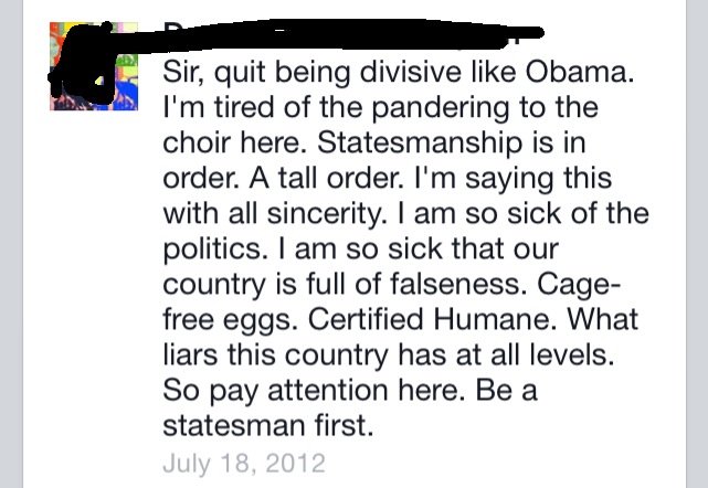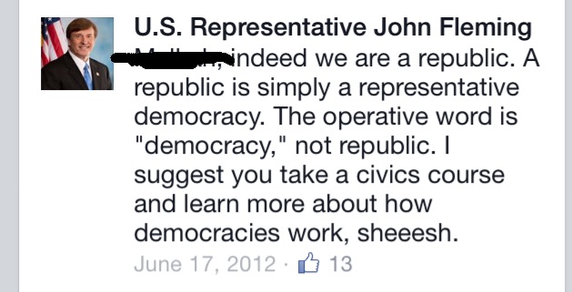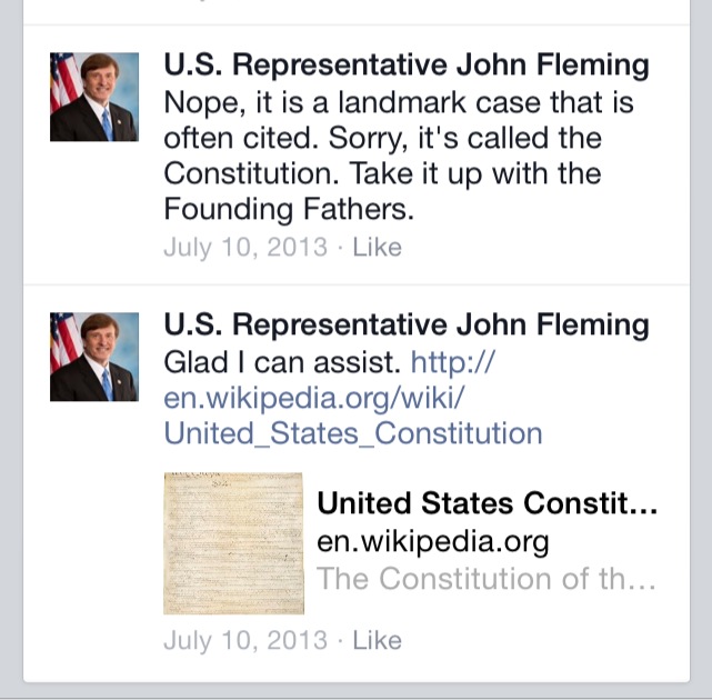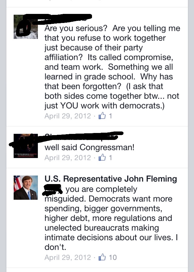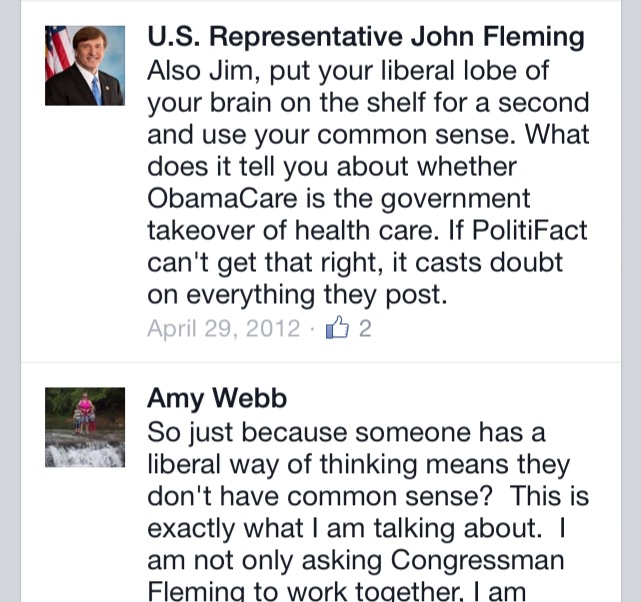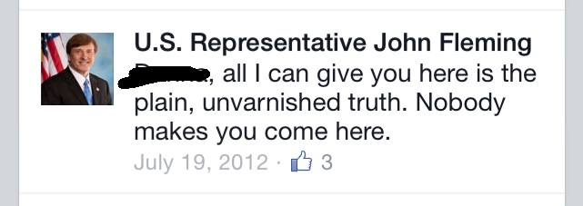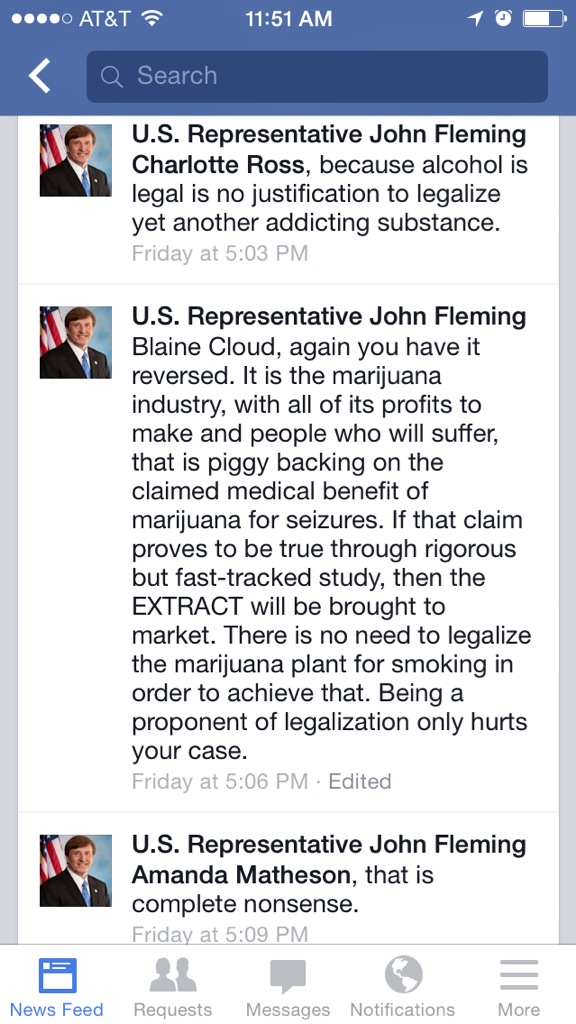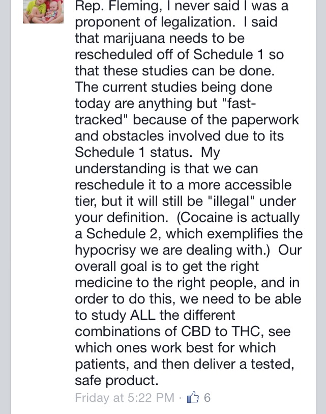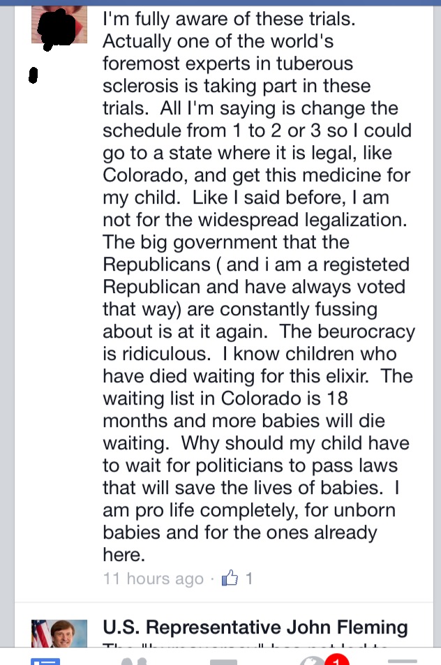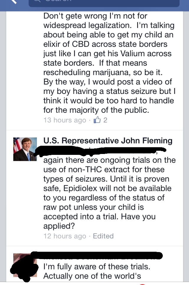 I’m not the only one. Several people who talked about their kids got deleted. Interestingly, he started debating with one of the parents–also a doctor –and did not delete or block him. However, he DID delete a link to a YouTube video that this father had made about his daughter and medical cannabis to educate the public. Interesting. Rep. Fleming is so passionate about Facebook page maintenance that he even stayed up until midnight on a Friday to edit, delete, and condescend. Yes, condescend. You may wonder why I find this particular representative so interesting when he is obviously not the only one who opposes helping our kids. Well, though I was blocked, I still found myself quite fascinated poring through his page. It became clear that his page serves no purpose but to rile people up and be divisive. It’s not even about whether I agree with his views or not; it’s that he clearly uses it as a tool of stirring discontent. Don’t get me wrong. I pretty much expect to see Obama-slamming on most GOP pages, just as there is some over-the-top Obama adoration on the pages of many democrats. But I looked over a few other pages from other parties and none gave me the same disturbing hateful feel that I got from his. I expect these pages to have opinions and criticisms. But what I found from the other ones I looked at is that I could also find positive comments about something they were involved with, or that I didn’t have to scroll far to get an idea of legislation they were involved with. Fleming, on the other hand, just seems to bitch and moan. I know his opinions, but very little of what he’s doing about it. Those posts are good and buried. I’m in no way saying he is the only one who behaves like this, but there are just too many people in Congress for me to look at all the pages. I looked at four other Republicans and four Democrats just to see if this is the norm, but saw nothing like this. All the pages are going to have rude comments from the public…the difference is that most of these other pages don’t seem as heavily moderated in that area. So when you make a point to delete and moderate heavily, you are implicitly showing support for what you leave in view.