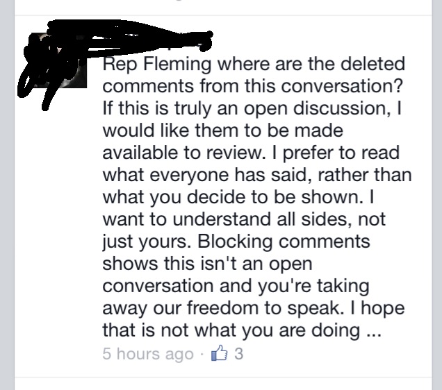So some of the parents got to stay and debate with him. I guess those of us that were deleted didn’t have anything constructive to say. So in the interest of helping others, I’m going to share some screenshots I took from other threads on different topics so that you will know what Rep. Fleming considers positive contributions to the discussion should you wish to engage without being banned. And please know that in an older thread, he has stated that cursing and name calling won’t be tolerated. But I guess that’s only if it’s about him.