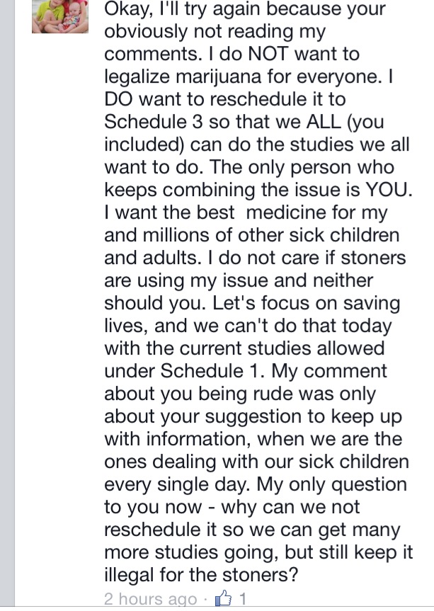 Here are some screen shots from the medical cannabis discussion with parent of sick children. He keeps talking about legalization, though many commenters are focused on rescheduling. He’s also completely in the dark it would seem about how damaging the schedule 1 status of marijuana is on research. But he won’t be told otherwise!