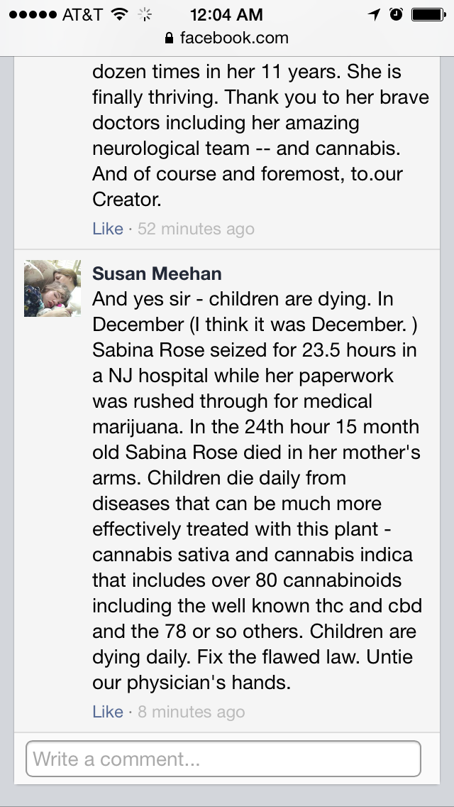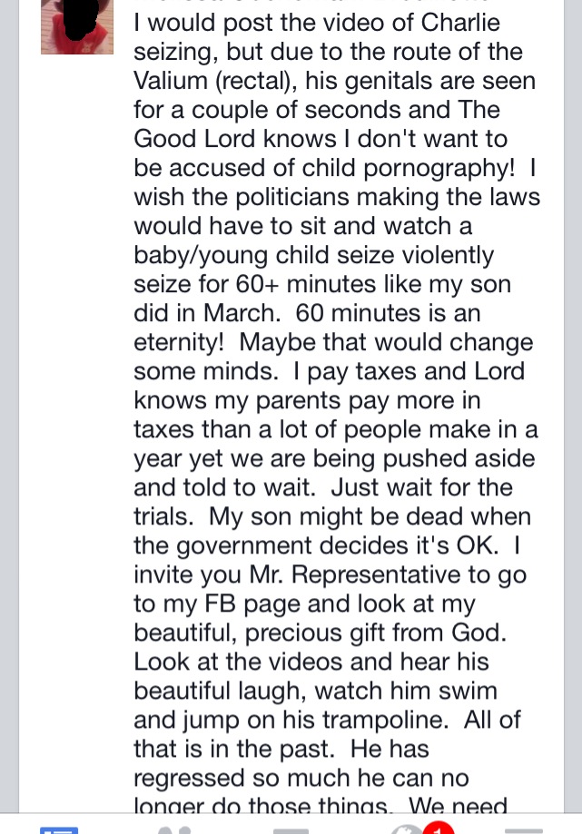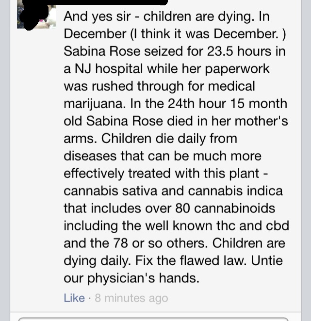 It’s his Facebook page that brought him to my attention, as well as to the attention of some other parents dealing with seizure disorders. He had posted about a speech he gave on the dangers of marijuana so several of us posted on the thread. Many of our comments got deleted. Several of us are blocked from commenting further. I will say, in the interest of full disclosure, that perhaps I implied I had doubts about his abilities as a medical doctor since I came across an article about how he blocked doctors from being able to discuss the medical marijuana option with veterans because he didn’t want them exposed to an addictive, harmful substance. Yet you never see him express any concerns about the highly addictive, dangerous nature of many pharmaceuticals. Prescription pain pills are some of the most highly abused drugs, but that doesn’t concern him. But I don’t think I got deleted and banned because I might have come off as insulting (there was no swearing or name calling). I think I got deleted because I talked about my kid and about how dangerous one of his prescriptions is. (And to be clear, I am not part of the anti-pharmaceutical movement, nor do I believe that marijuana is a cure for everything or that it will work for everyone. I think pharmaceuticals have their place alongside options like cannabis. I just ask that my zip code not determine my access).