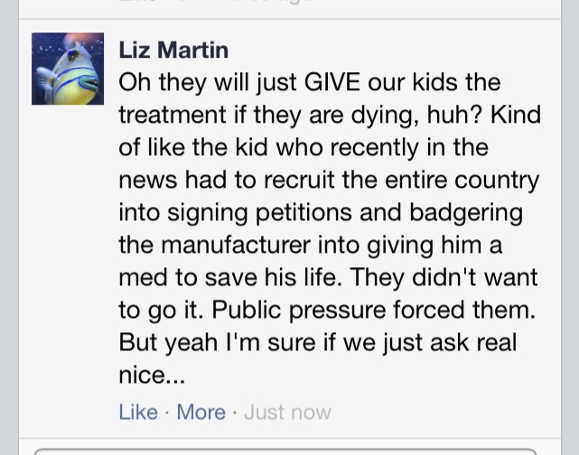 Yeah, pretty sure we explained that (in now deleted comments) that this wasn’t an option for everybody and some kids will be dead before Epidiolex goes to market. Not to mention, Epidiolex is one particular formulation. It’s not necessarily the same as what some of the kids are responding to. It may work for some, but others will need whole plant medicine.