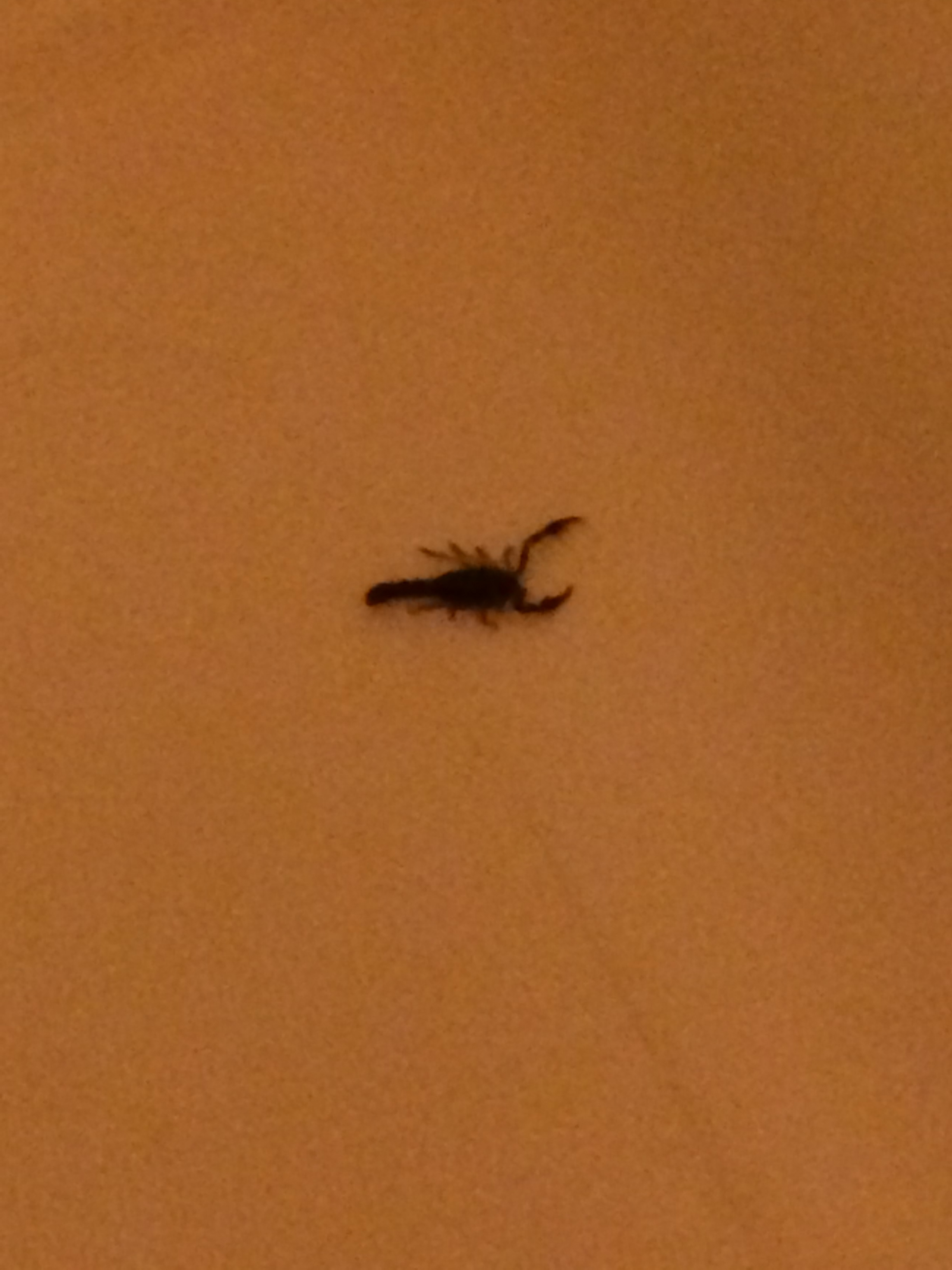 Chris was the first to drag himself out of bed and head to the bathroom. I heard him utter, “What is that?! Is that a scorpion?!” Haha. Chris is the boy who cried scorpion (and various other creepy crawlers) to scare me so I just said, “Yeah, right.” He continued to insist there was something in the bathtub, so I got up to look. I didn’t even make it to the door because right there in my path: