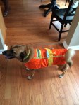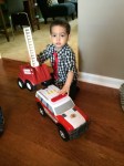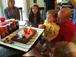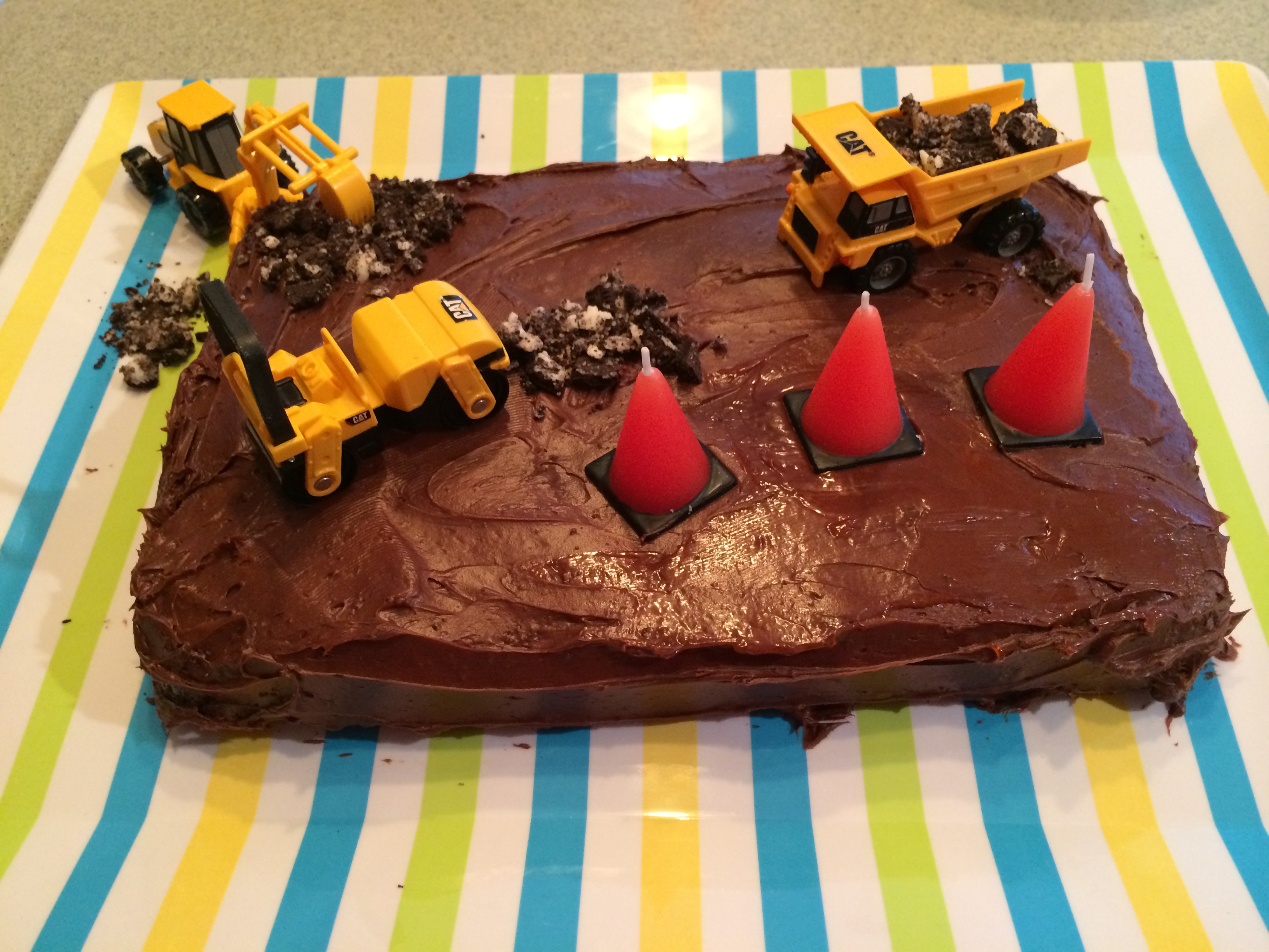 We celebrated Connor’s construction-themed birthday a week early since we needed to be out of town for a wedding on his actual birthday. He was very accommodating in that he doesn’t know what date it is anyway and never has objections to being given trucks on any given day. Rosie the dog donned her construction gear and I even tried my hand at amateur cake making: